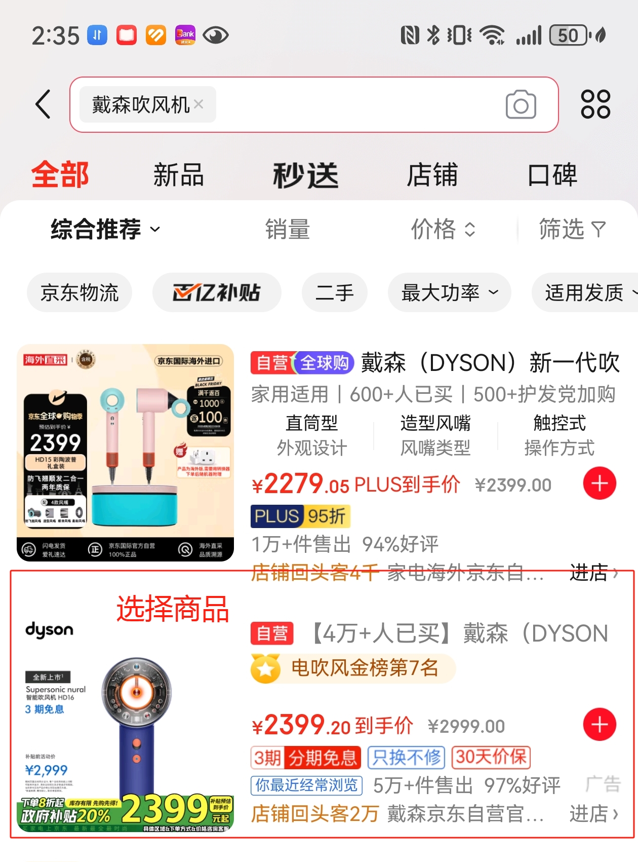 (一)打开京东,搜索商品,例如搜索“戴森吹风机”进入商品列表,点击想要的商品。